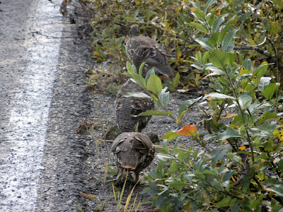 Then, all three were pecking grit off the shoulder. These birds require a tremendous amount of grit to make their digestive transition from fall berries and leaves to the winter diet of fibrous needles.