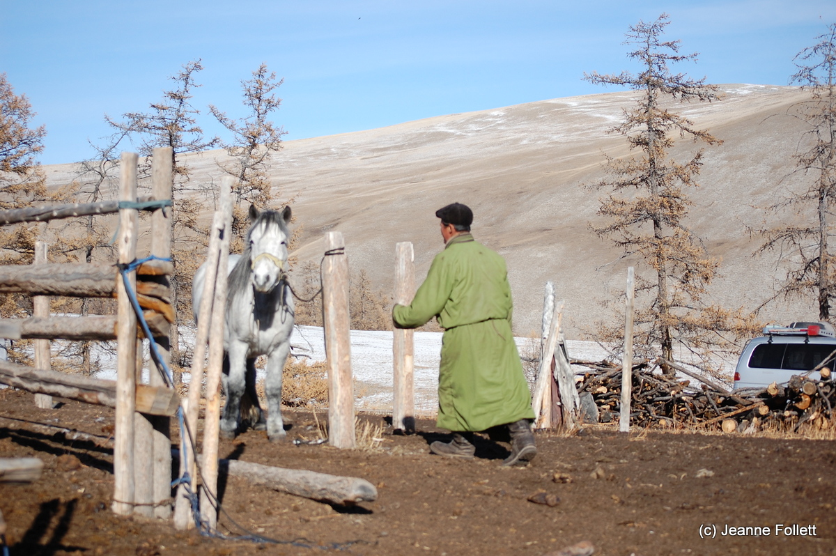 herded to at night to keep them safe from predators, then we reach the khoroo—the horse corral. One horse is tied outside the corral and it