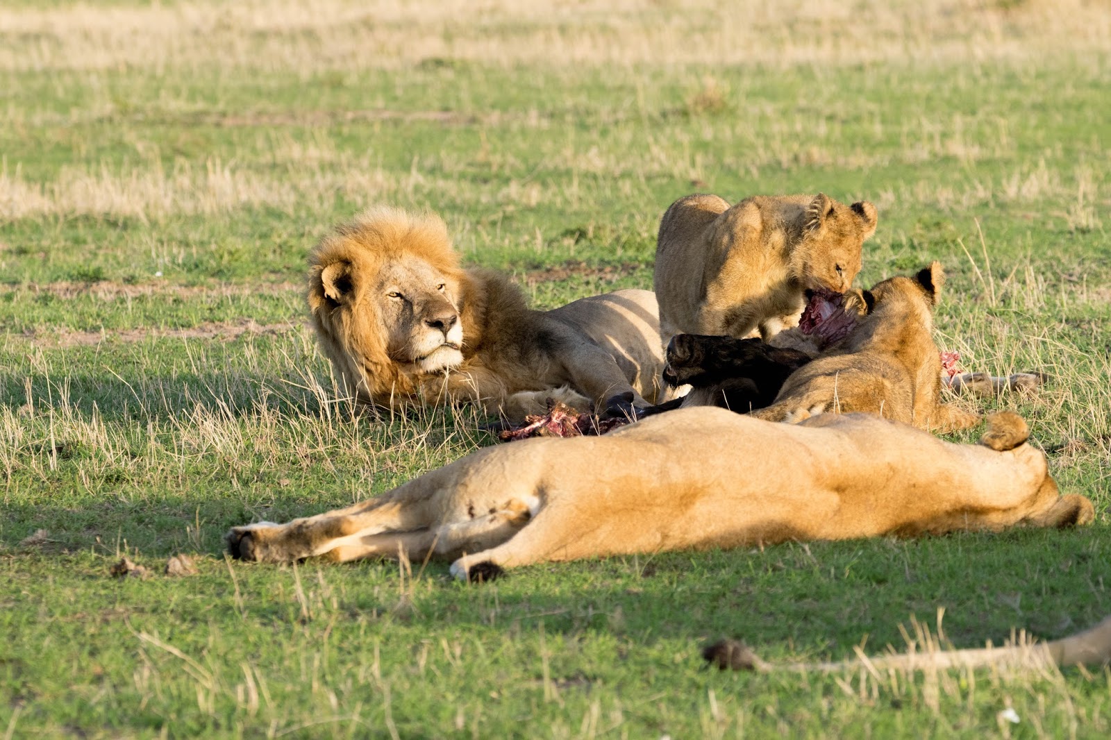 pride is sacked out around the carcass of a wildebeest. It’s obvious the lions have fed well during