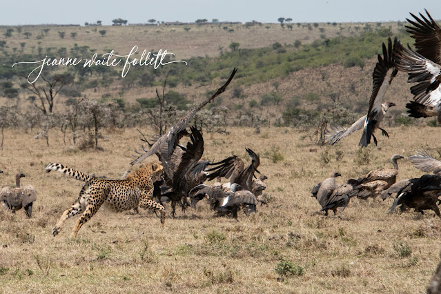 Then the vultures, the primary part of the clean-up crew, begin to arrive. We watch and hope no hyenas know of the kill, as they will steal it from the cheetahs. Cheetahs fight to defend their cubs as much as they can, but the bite of a hyena can crush bones.