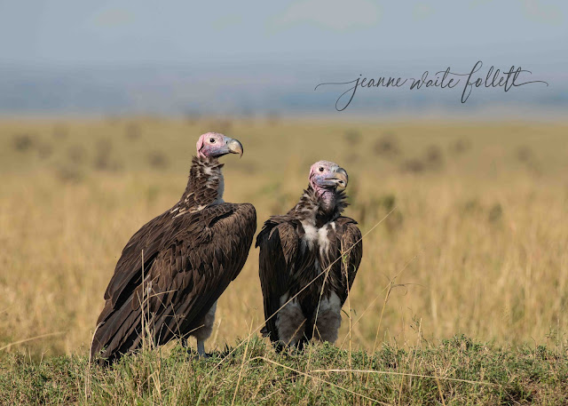 Near us, also observing the balloons are a pair of lappet-faced vultures, so called because of the fleshy skin folds on their faces. With a wingspan of eight and a half feet, they are the largest vultures win Africa. They are also considered the most shy, though this two sat and let us take photos.