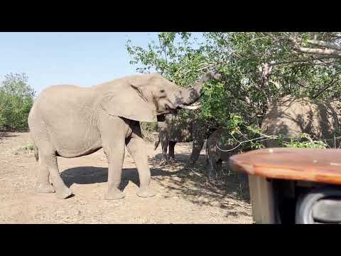 One of the smaller elephants, probably an auntie, has a different opinion, and it definitely signals a warning. First, by reaching out its trunk and smelling us.